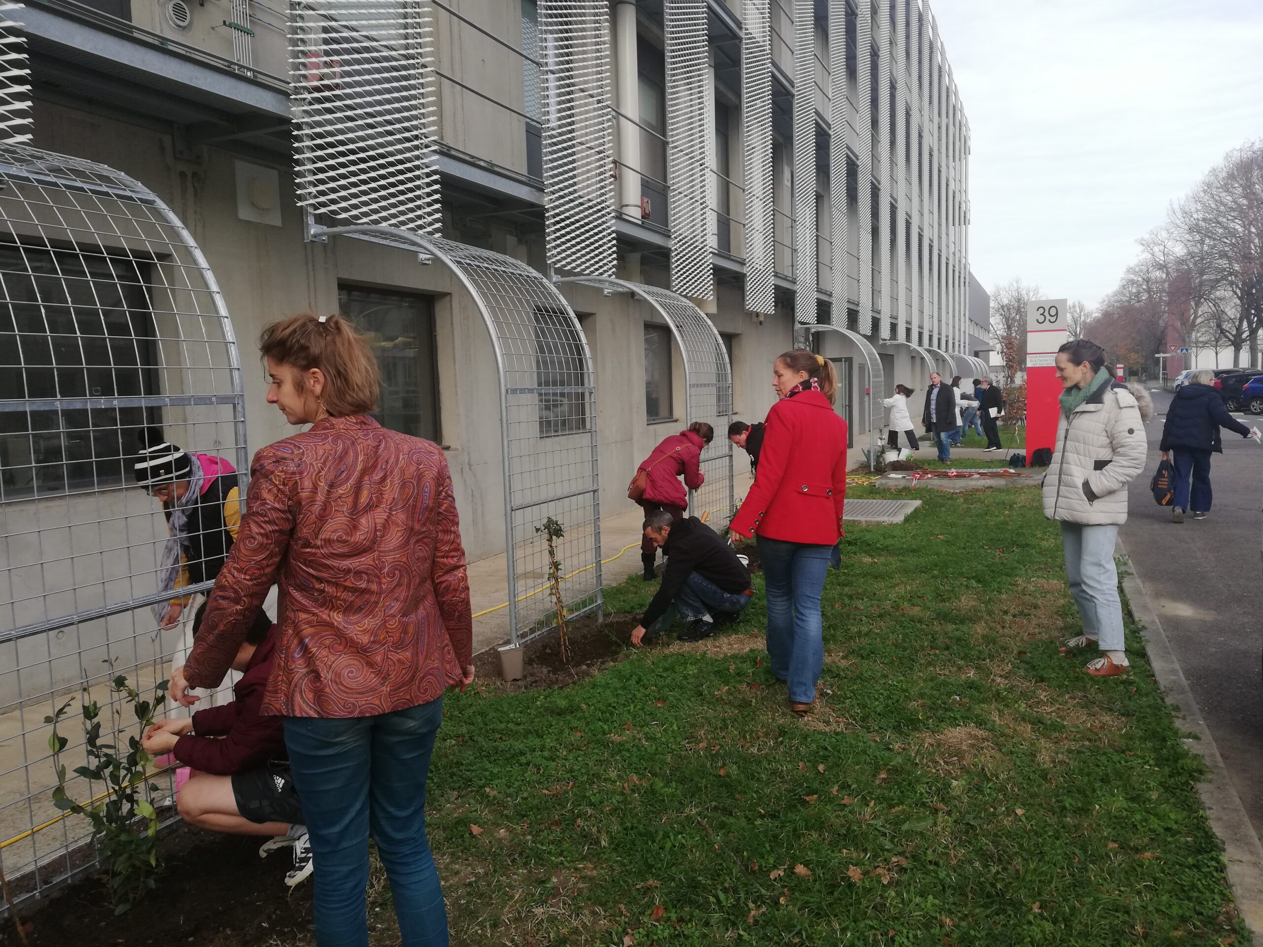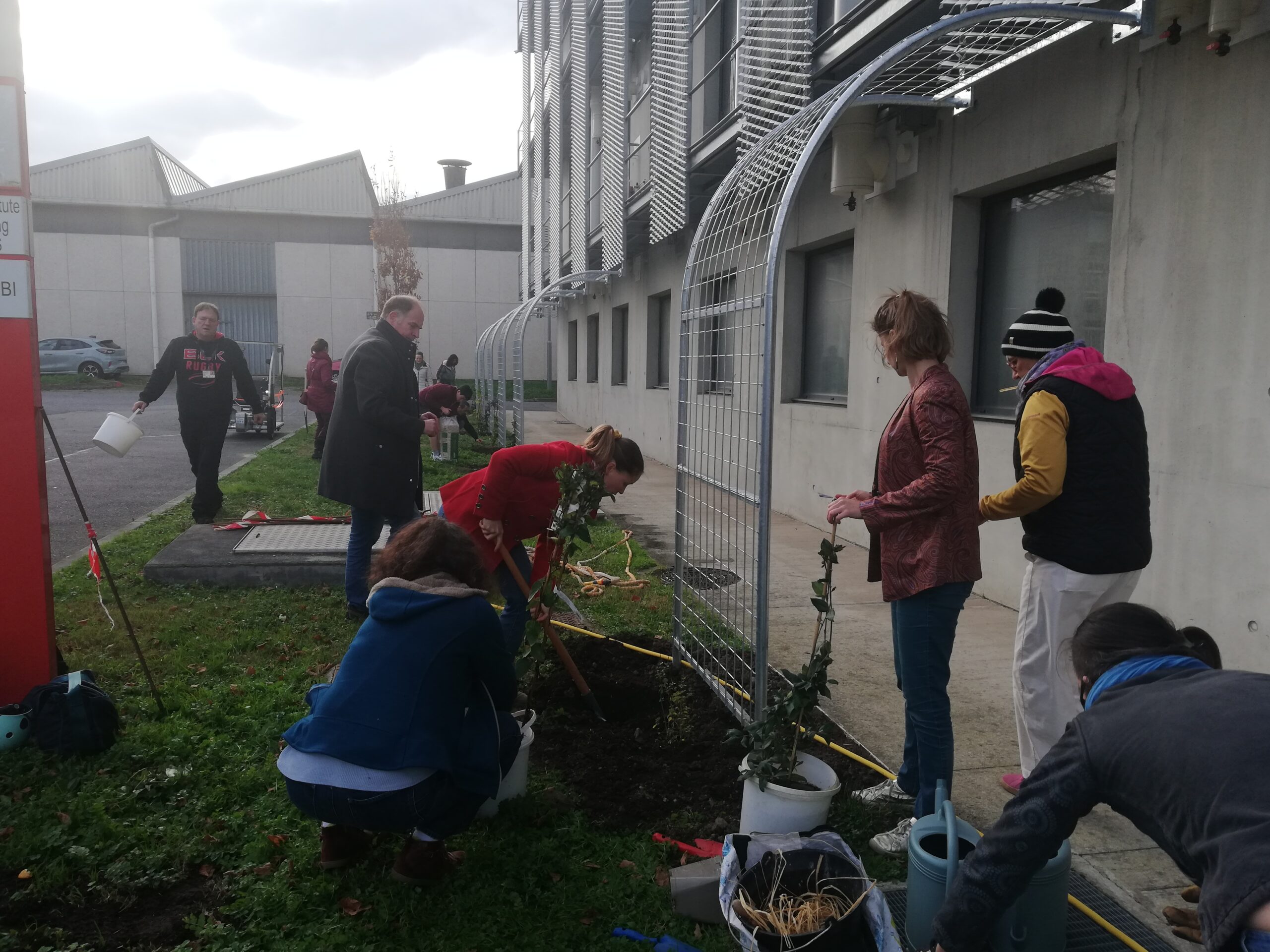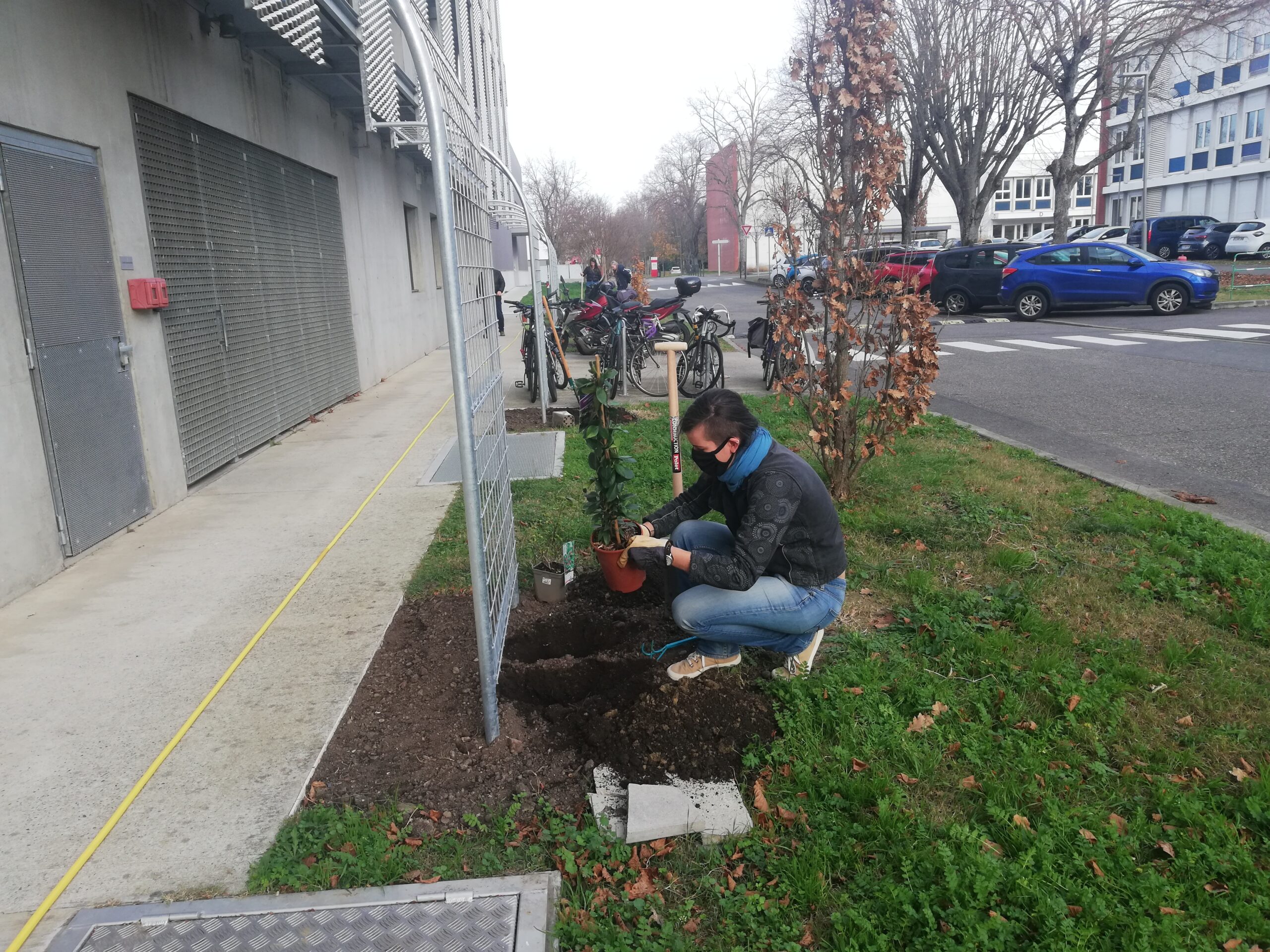 La semaine dernière, les personnels du laboratoire ont planté les premières plantes qui viendront recouvrir les structures métalliques de la façade sud du laboratoire TBI.