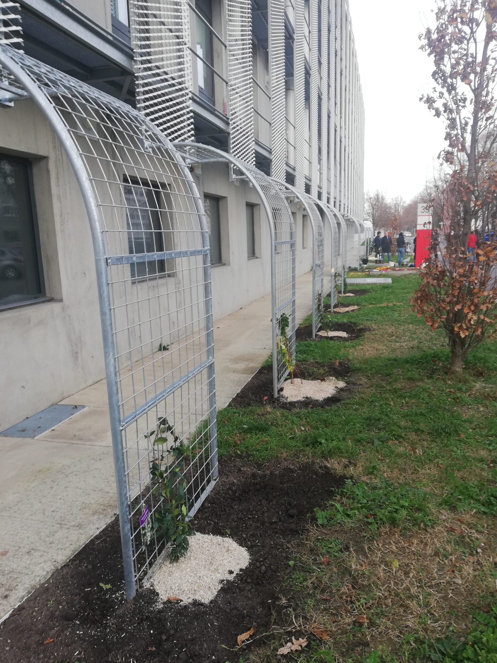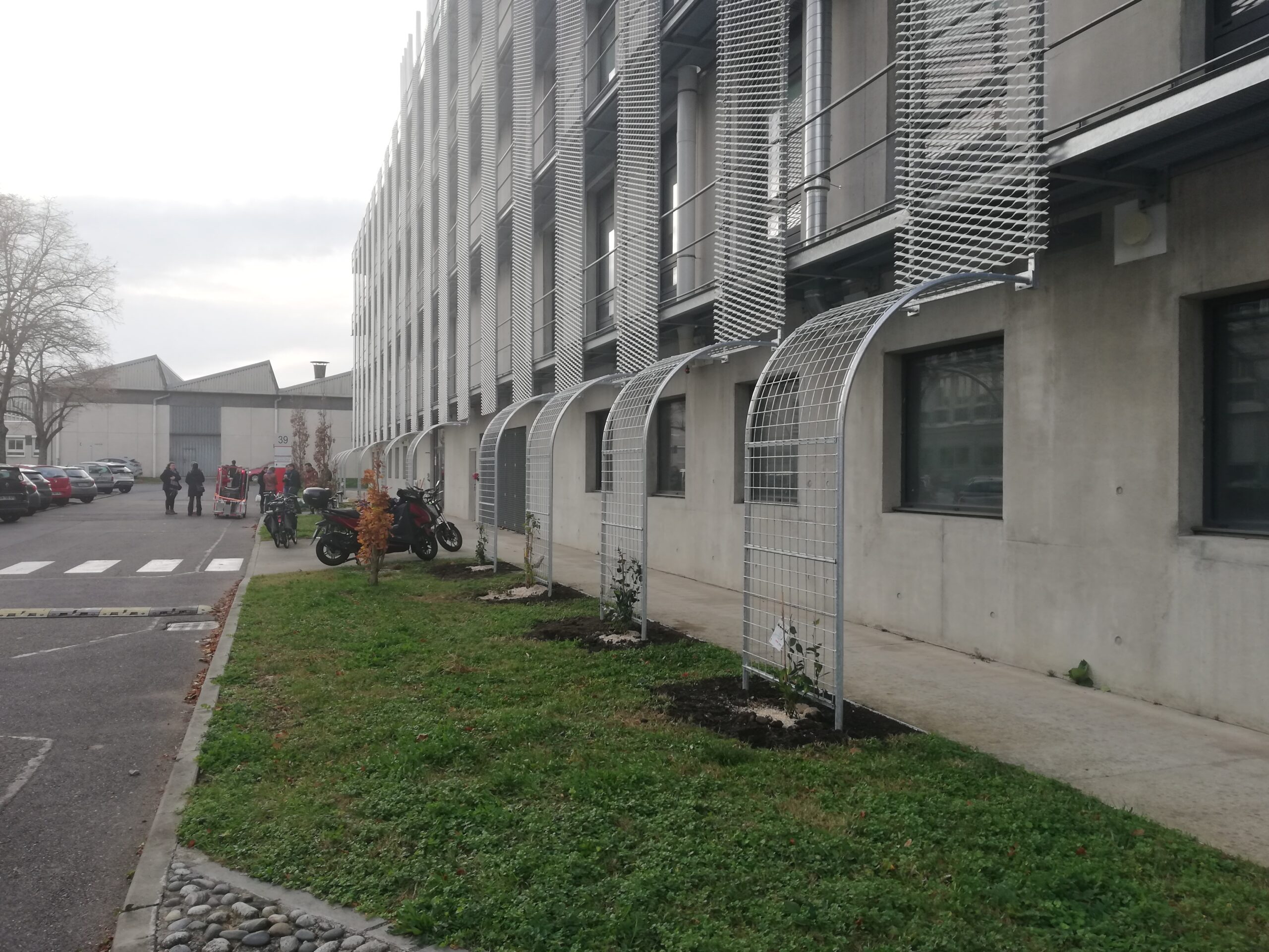 Ce projet vise à installer des structures métalliques en forme d’arches pour amener des plantes grimpantes du sol aux grilles de la façade d’entrée du bâtiment. Son objectif principal est de favoriser la biodiversité en offrant un habitat aux insectes et araignées qui pourront servir de nourriture aux oiseaux. La végétalisation de la façade sud de ce bâtiment, qui a un aspect plutôt industriel pour l’instant, s’inscrit dans le cadre d’un projet global de re-végétalisation du campus de l’INSA de Toulouse auquel TBI et le CNRS ont souhaité s’associer. L’impact de cette re-végétalisation sera étudié du point de vue de la biodiversité, de la qualité de vie au travail, de la perception de la biodiversité, de la lutte contre les ilots de chaleur et dans une moindre mesure et à plus longue échéance en termes d’économies d’énergie.