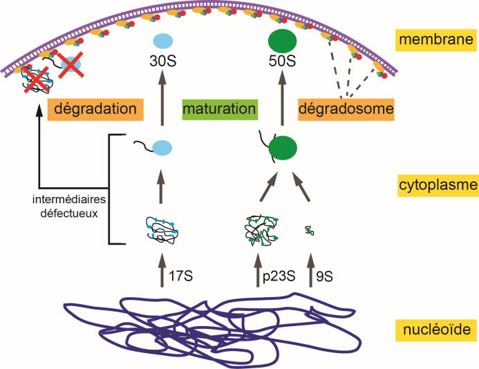 Figure : RNA degradosomes attached to the inner cytoplasmic membrane control the quality of ribosome assembly after the release of nucleoid intermediates.