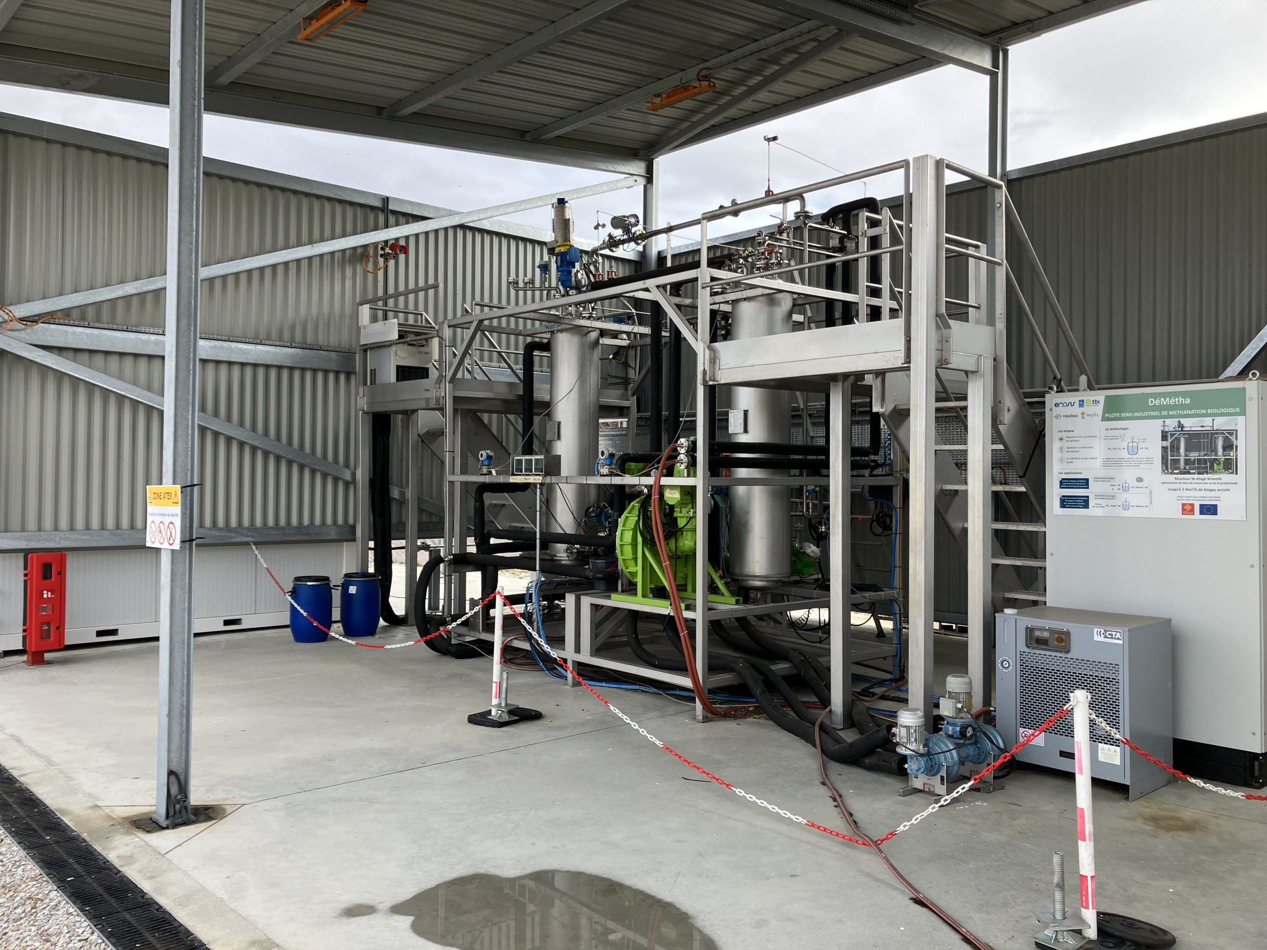 Demetha : bioréacteur à deux étages utilisant une culture mixte de micro-organismes pour enrichir le biogaz en méthane. Il a été conçu pour optimiser le taux de conversion du CO2 en méthane avec un rendement supérieur à 99 %. Le pilote peut valoriser jusqu’à 5 Nm3/h de biogaz en méthane de qualité réseau.