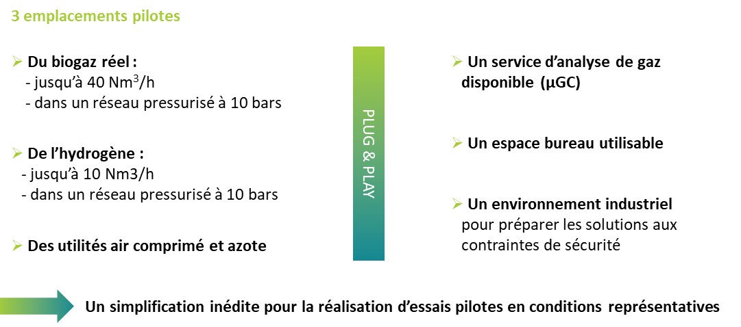 Les deux premiers pilotes accueillis sur la plateforme sont des pilotes de méthanation qui transforment le CO2 contenu dans le biogaz en méthane à l’aide d’hydrogène produit par électrolyse de l’eau.